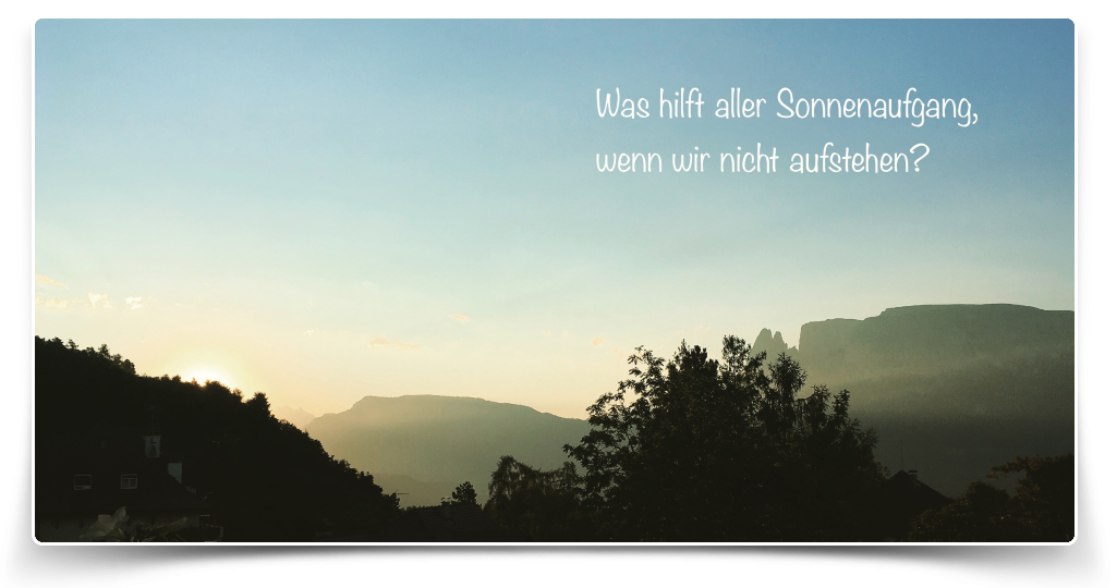 Ich wünsche dir einen wunderschönen guten Morgen. Ich hoffe, du hattest einen guten Start in den Tag! Auf dem Seminar, das ich vergangenes Wochenende besucht habe, las ich das Zitat "Was hilft aller Sonnenaufgang, wenn wir nicht aufstehen?" von Georg Christoph Lichtenberg. Unmittelbar in dem Moment befand ich mich gedanklich zurück an den Morgen, wo ich vom Balkon aus den Sonnenaufgang beobachtete, den ich mit diesem Foto festgehalten habe. Dieser Augenblick erinnert mich immer wieder daran, wofür ich morgens aufstehe. Mir meiner Lebensziele bewusst zu werden.